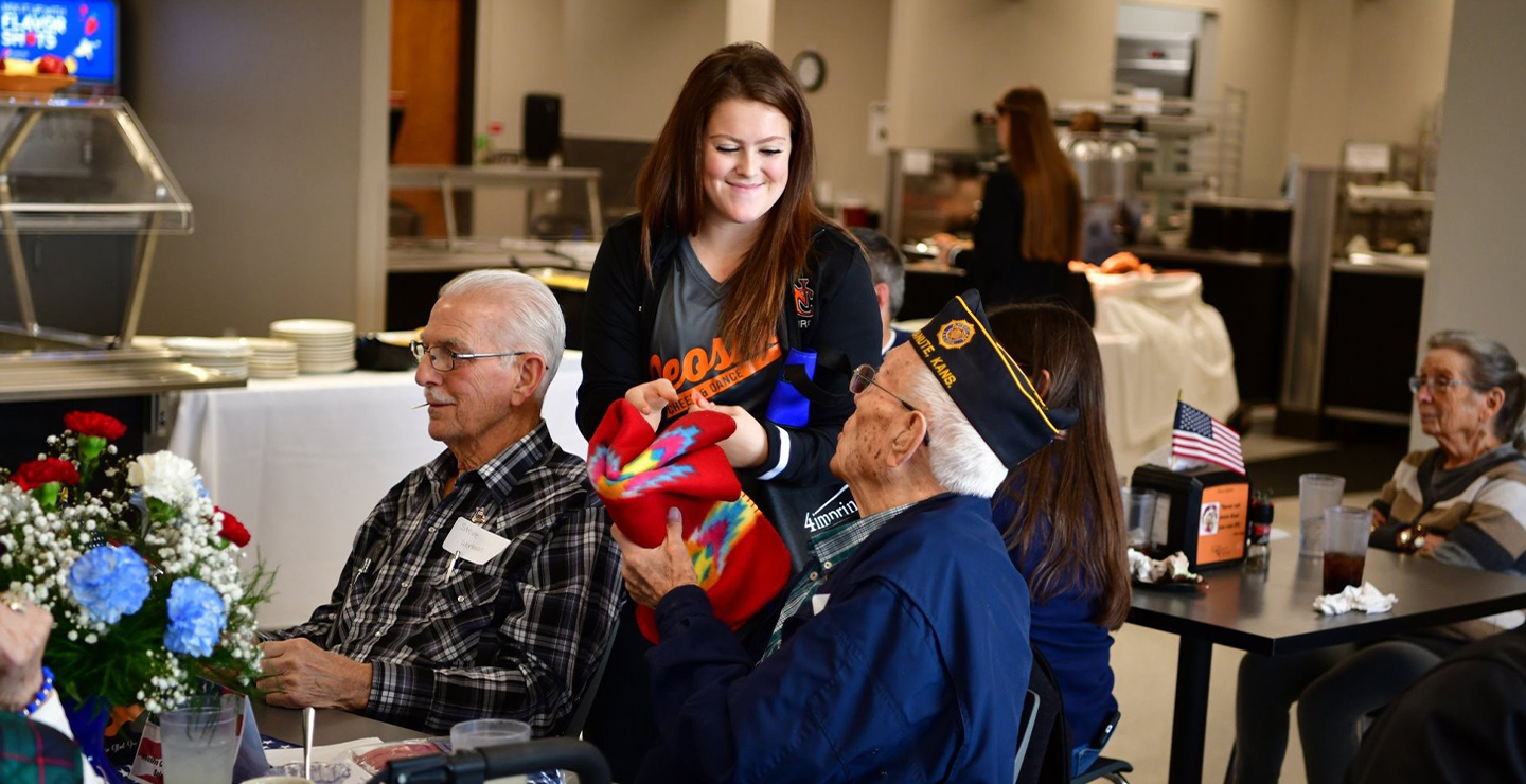 It is a tradition of the Neosho County Community College Spirit Program to participate in a community service Scavenger Hunt the first week of school. This has been a fun way for their team to bond together, set a standard for representation, and give back to their supportive community. This allows them to get familiar with the people and places of the town by cleaning windows, picking up trash, leaving uplifting notes, taking a snack and water to local policemen, and a variety of other tasks. Another big service they have participated in for the last two years is their Veterans Day Luncheon. The team helps transport Veterans from their cars to the school’s Student Union, where they are greeted with goodie bags and led to the cafeteria. They then help carry trays, get drinks, and socialize with our veteran community throughout the meal. They also sign Christmas cards for the Veterans to be sent during the holiday season. The team is always a so humbled by the experience, and grateful for the opportunity to show their appreciation for their service to our country. Over the past year, this program has put in over 300 hours of community service, not just counting these events, but also serving at local organizational parties, hosting mini cheer clinics, delivering Poinsettias during the Holidays, as well as helping clean up and provide meals for vendors during town festivals. Serving and giving back is an essential aspect of our SHO Spirit culture!