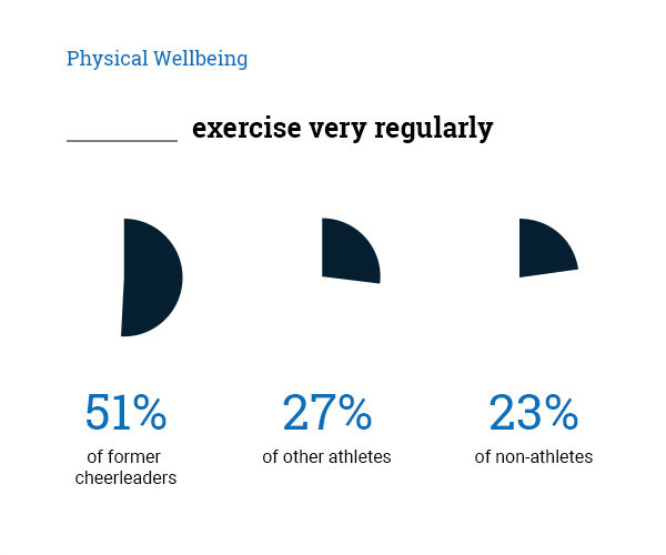 • Engage in exercise: 51% of former cheerleaders engage in physical exercise regularly (e.g., 30 mins at least 5x a week or 10,000 steps a day) compared to 27% of other athletes and 23% of non-athletes.