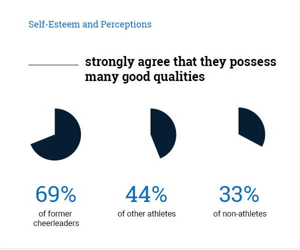 • 69% of former cheerleaders feel that they have a number of good qualities compared to 44% of other athletes and 33% of non-athletes.