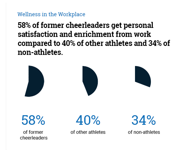 • 60% of former cheerleaders are more likely to maintain work-life balance compared to 48% of other athletes and 46% of non-athletes.